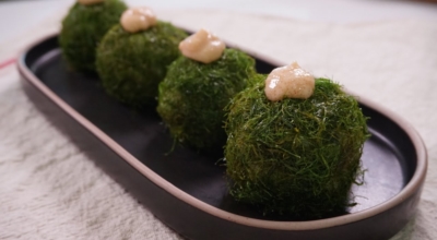 식힌 밥은 참치와 깨, 마요네즈를 버무려줍니다. 감태는 비닐에 넣고 손을 만져가며 분쇄할 수 있게 합니다. 버무려진 밥은 동그랗게 말아서, 그 비닐 안에 감태를 묻혀주도록 합니다. 예쁜 접시에 담으면 완성입니다.