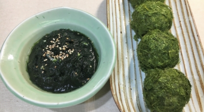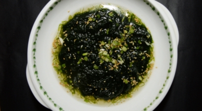 감태는 체에 밭쳐 흐르는 물에 두 번 정도 흔들어 헹궈 건져냅니다. 감태를 마지막 헹굼을 할 때 감태 비린내 제거를 위해 마지막 헹굼 물에 청주를 넣고 버무려 건져 물기를 빼줍니다. 감태의 물기를 뺀 후 잘게 썰어 준비합니다.