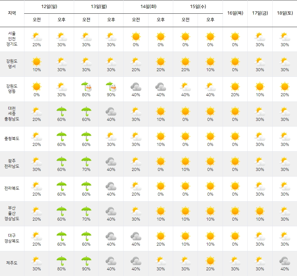- (강수) 12일(일) 오후~13일(월) 오전은 흐리고 비가 오겠습니다.