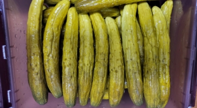 소금과 소주를 넣었기 때문에 오이에서 물이 발생하게 되는데 발생된 물 그대로 뒤집어 줘요. 이보은 님은 12일 보관하면서 매일 1번씩 뒤집어주어 총 12번을 뒤집어주셨다는데요, 그 오이지가 바로 위 사진의 모습이에요. 보기에도 아주 맛있어 보이는데요, 한 개를 꺼내어 반으로 갈라봅시다.