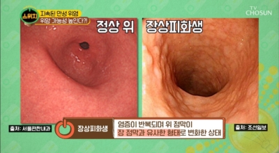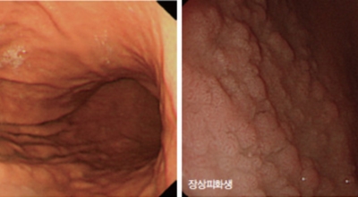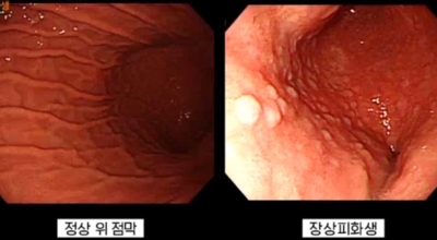 장상피화생이라는 것은, 위점막 세포가 오랜 시간 손상과 재생을 반복하다가 어느 순간 대장과 소장 점막 세포로 바뀌게 되는 것을 말하는데,. 위의 점막이 사라지고 위 점막에 수많은 돌기가 생성되며 점막이 모두 회백색으로 변하게 되는데요. 위 점막에는 소화를 돕는 갖가지 기능이 존재하지만, 이것들이 장 세포로 전환이 되면 소화 기능이 현저히 감소하게 돼요. 그리고 장상피화생은 위암 발병률을 최대 10배까지 높일 수 있 다고 알려져 있어 주의가 필요한 질병이지요.