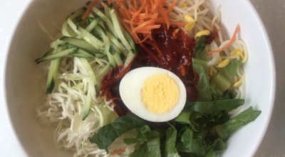 준비 재료: 쫄면사리, 오이, 당근, 양배추, 콩나물, 깻잎, 삶은 계란
