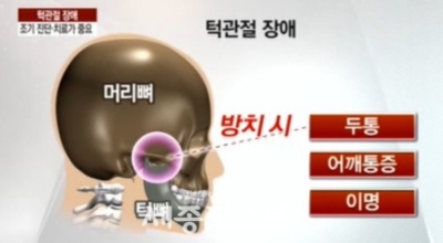 턱의 신경이 경직되고 민감해짐에 따라 주변의 경근 역시 뭉치고 결리는 증세가 함께 동반되는 것인데 일반적으로 턱의 컨디션이 좋아지면 되돌아오는 경향이 있습니다. 턱에서 '딱딱' 소리가 지속적 장기적으로 나게 되면 귀에서도 이상증상이 발생할 수가 있는데 바로 이명입니다. 귀가 윙윙 울리고 청각에 약간의 장애가 동반되는 것이데 신경성일 가능성도 배제할 수가 없습니다.