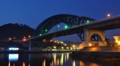 총연장 591m, 폭 20m의 강아 치트러스 공법과 프레이트거드 공법을 복합시켜 가설한 통영대교는 상판 아치구간 140m에 푸른 계열 조명을 연출하는 투광등 196개를 설치해서 밤이면 온화하고 포근한 푸른 조명을 발산해요. 이 조명이 수면에 투영되면 럭비공 모양의 무수산 투영상이 성립되어져 이일대가 새로운 야간 관광 명소로 주목을 받고 있습니다. 24시간 개방되고 있으며 휴무일과 입장료는 없습니다.