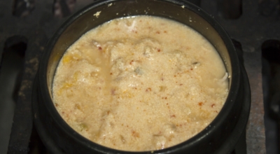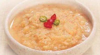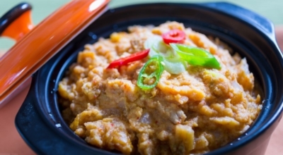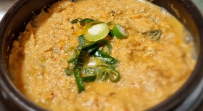 재료 : 콩비지 2와 2/3컵 (400g), 정수물 1과 1/2컵 (270g), 신김치 1컵 (130 g), 다진 돼지고기 약 1/2컵 (85g), 양파 1/4개 (60g), 대파 1/2대 (50g), 새우젓 약 1큰술 (22g), 청양고추 2개 (20g), 식용유 2큰술 (14 g), 간마늘 1/2큰술 (10g), 국간장 1큰술 (10g), 참기름 1큰술 (7g), 굵은 고춧가루 1/2큰술 (4g)
