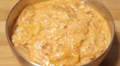 ※재료 : 찌개용 두부 1모, 물 1컵, 진간장 2 큰 술, 고춧가루 2 큰 술, 설탕 1 큰 술, 다진 마늘 1 큰 술, 참기름 1 큰 술, 식용유 1 큰 술, 돼지고기 100g, 신김치 100g, 다진 청양고추 1 큰 술, 들깻가루 1 큰 술, 양파 1/4개, 멸치액젓 약간(간 맞추는 용), 대파 10g